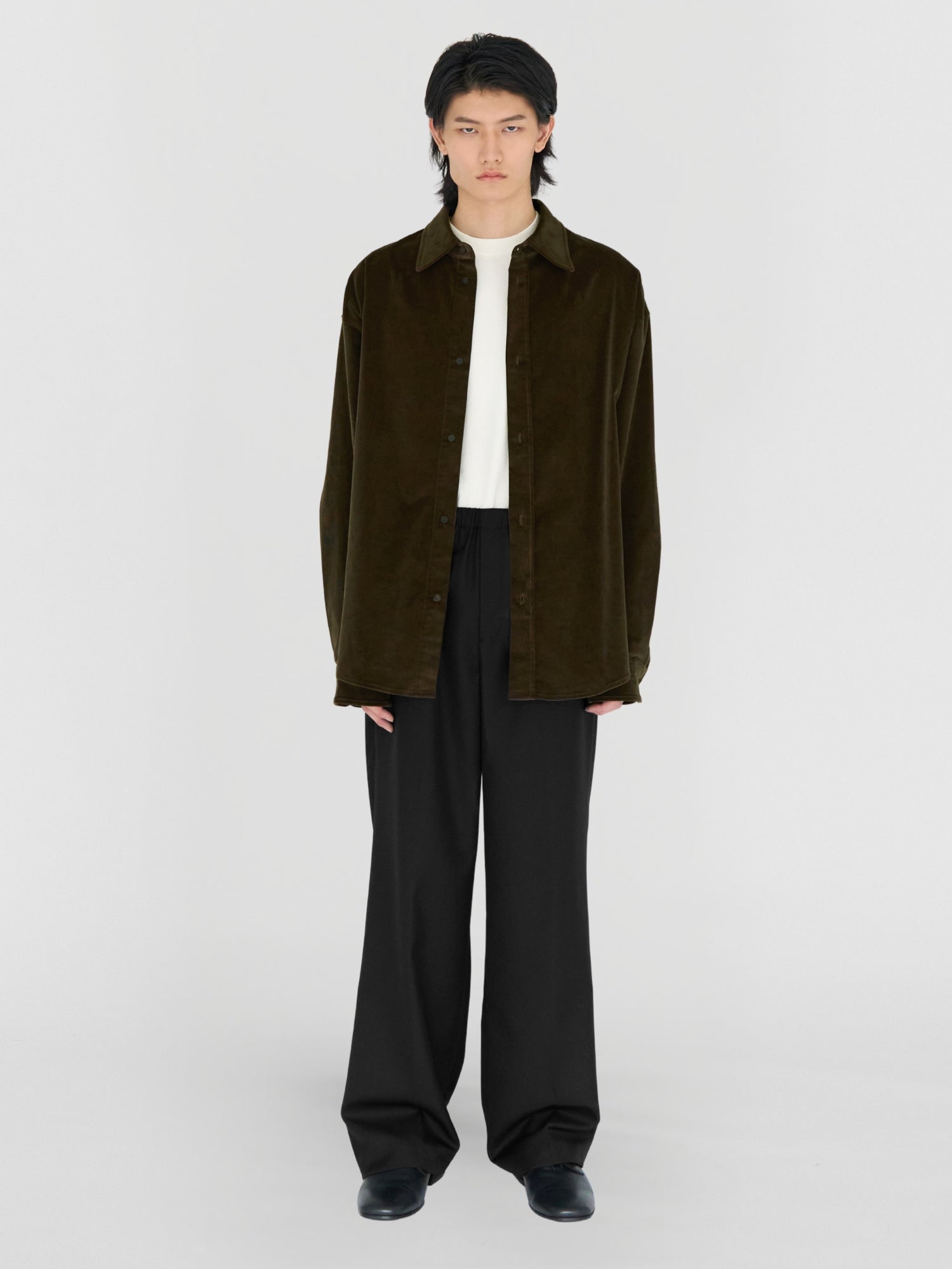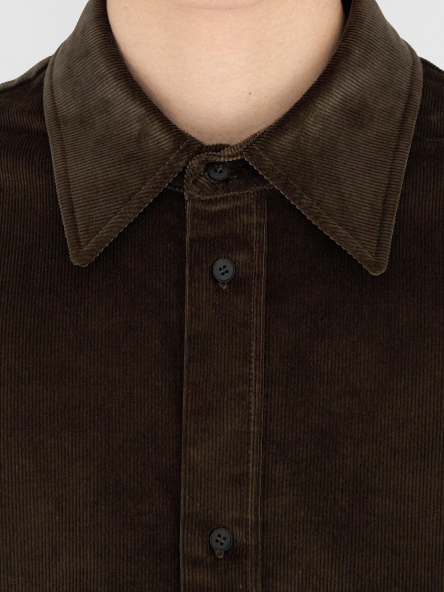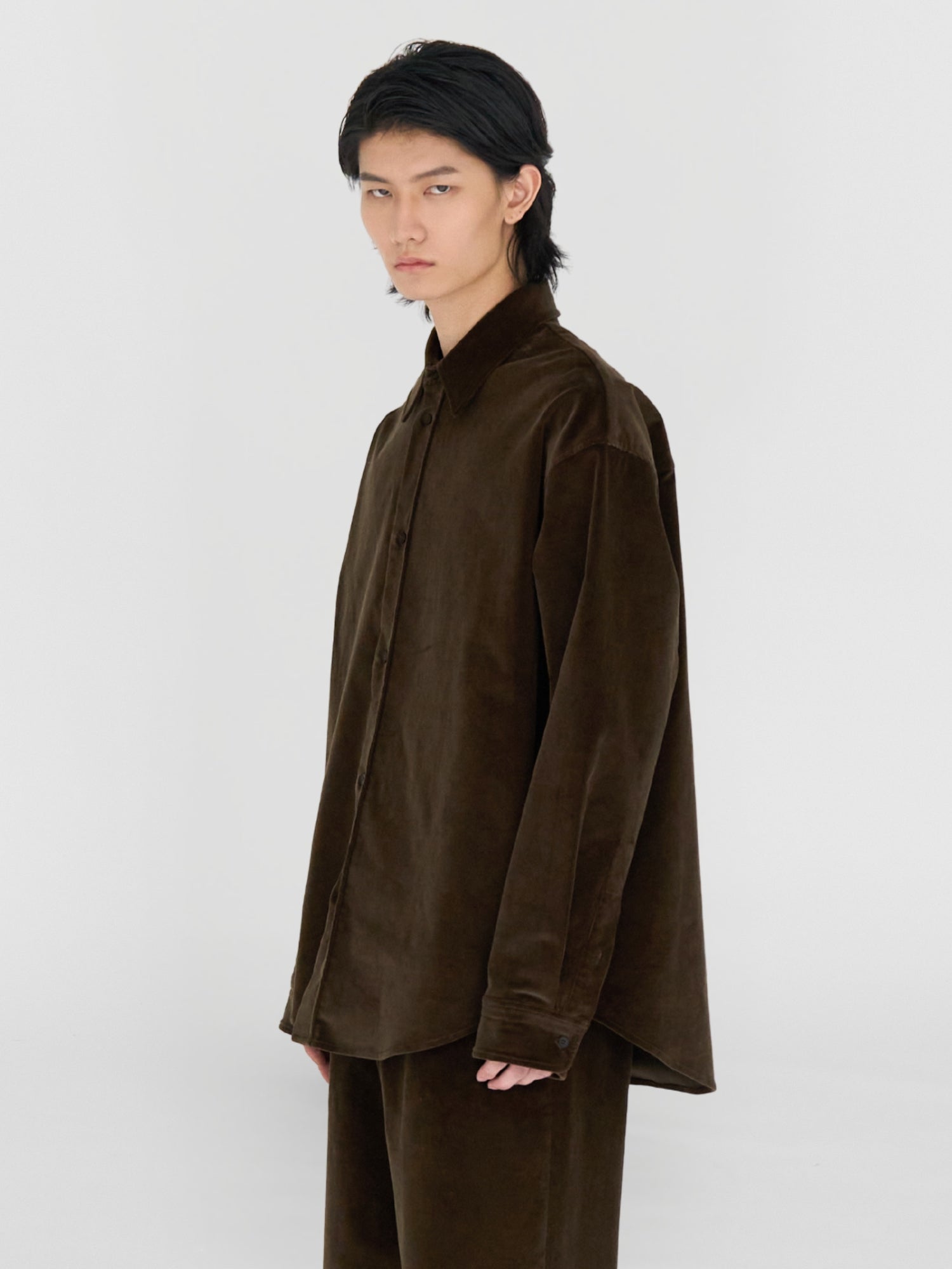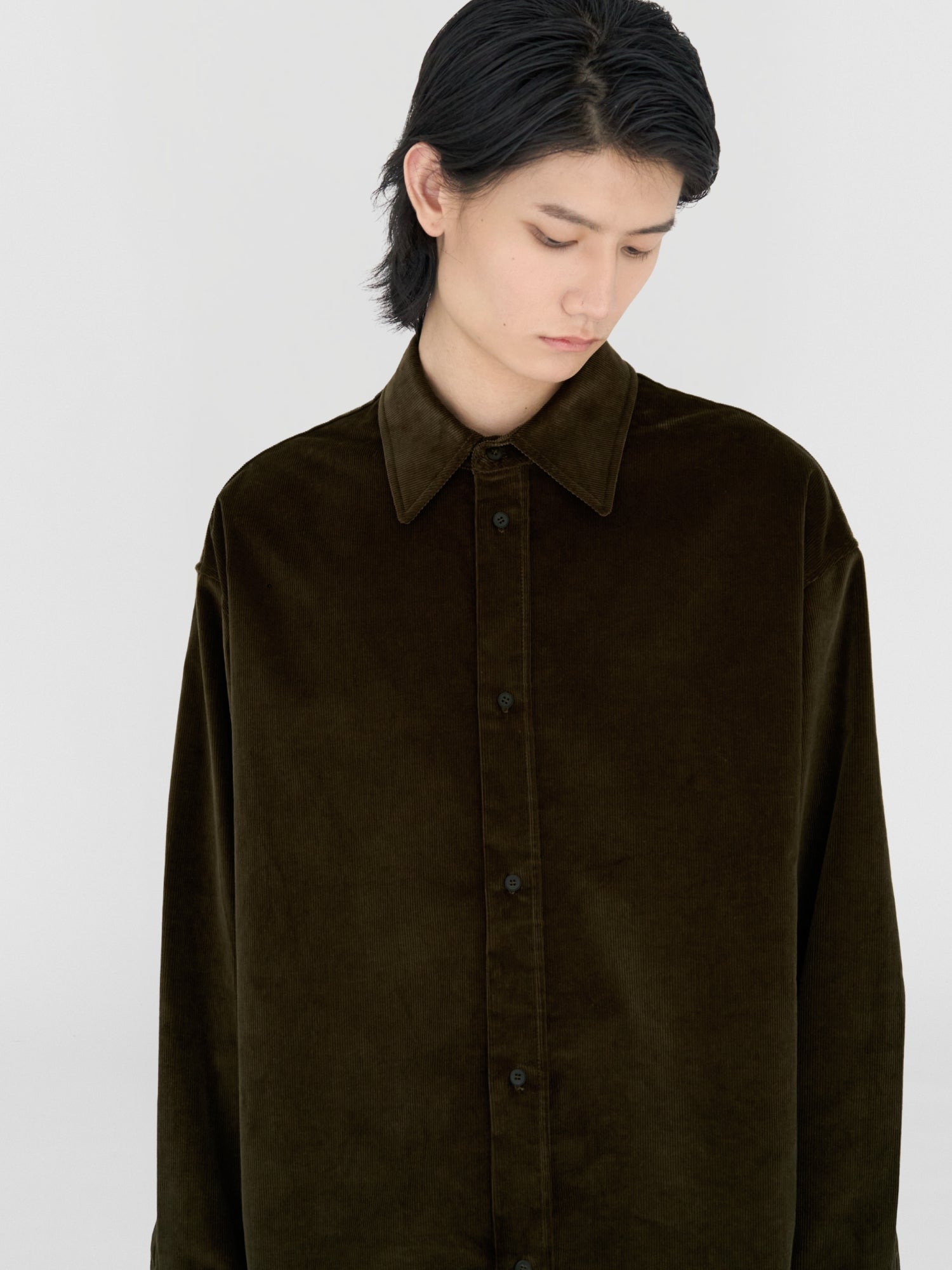 The DAVID Shirt is tailored from a refined Japanese 16-wale count cotton corduroy, it features a soft, brushed outer texture and a distinctive lustrous sheen unique to premium corduroy. The fabric offers substantial thickness that lends structure without heaviness. Thoughtful details—such as a reversed front placket, curved hem, and refined pleating at the back and sleeves—add quiet distinction to the design. Cut to an oversized silhouette, it can be worn effortlessly as outerwear or worn on its own.
