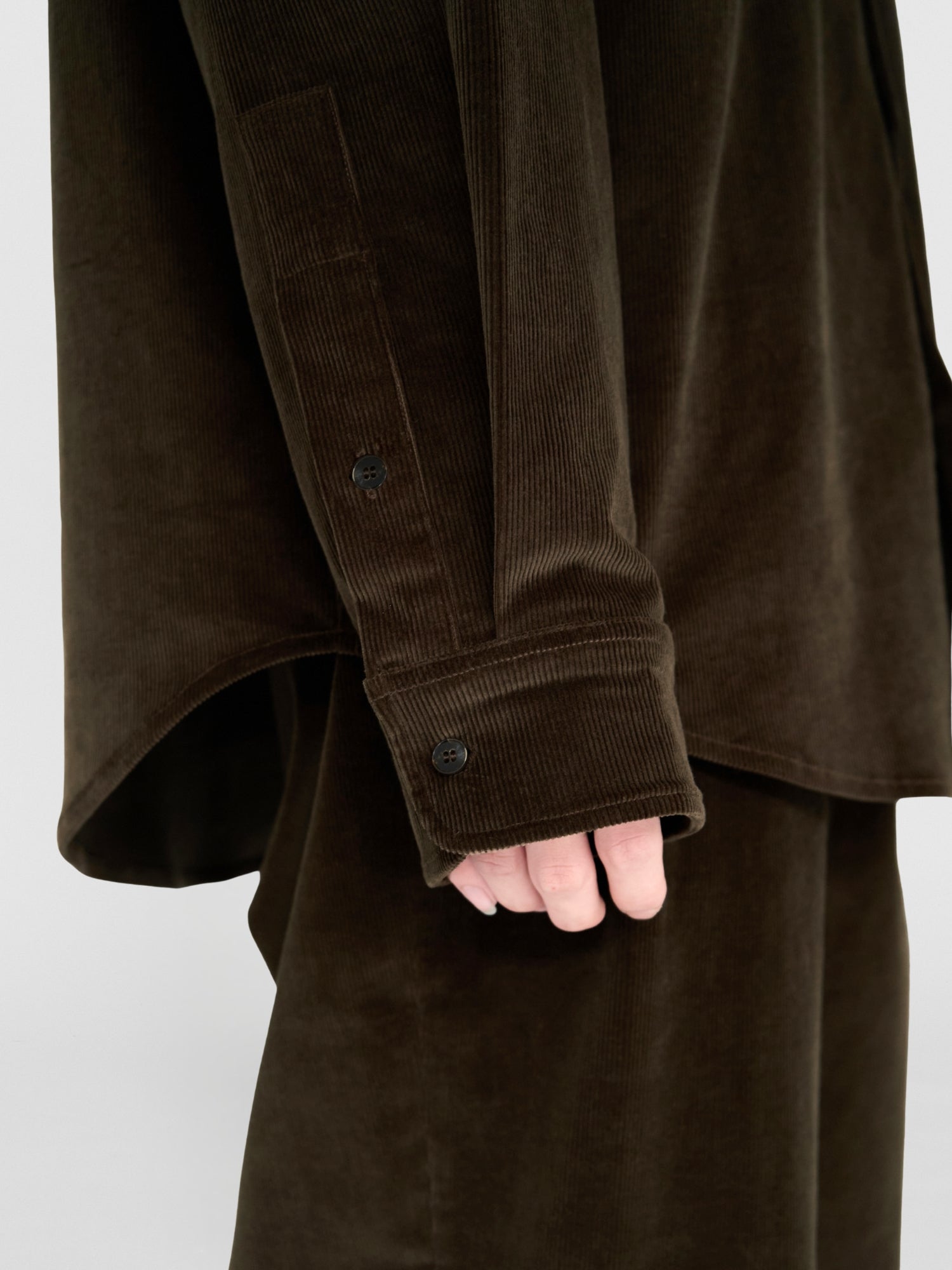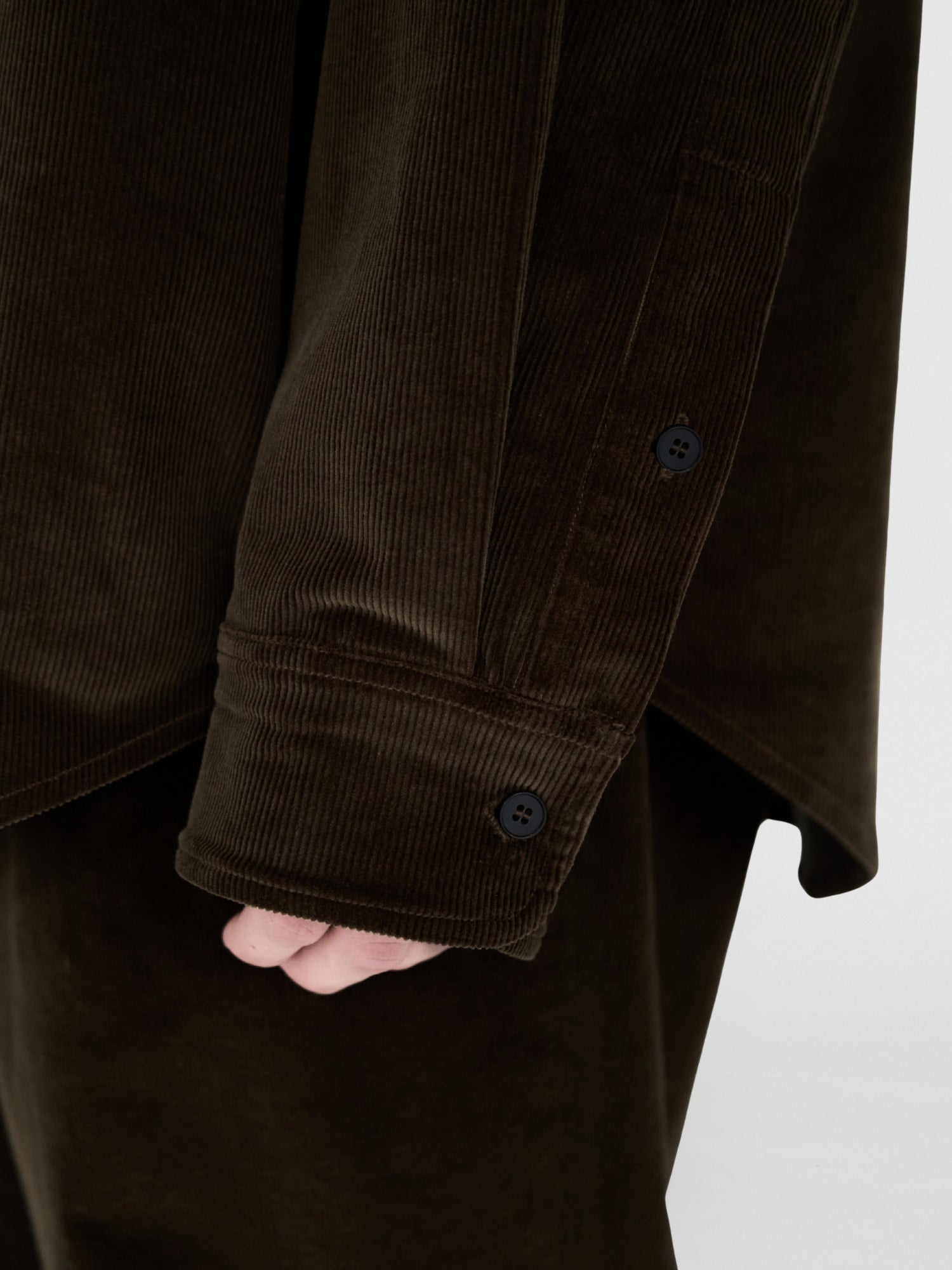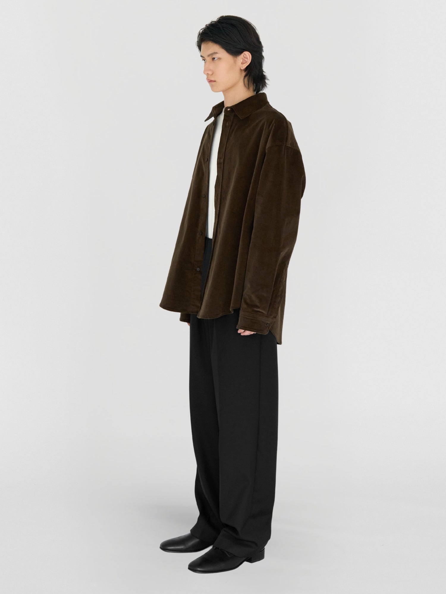 The DAVID Shirt is tailored from a refined Japanese 16-wale count cotton corduroy, it features a soft, brushed outer texture and a distinctive lustrous sheen unique to premium corduroy. The fabric offers substantial thickness that lends structure without heaviness. Thoughtful details—such as a reversed front placket, curved hem, and refined pleating at the back and sleeves—add quiet distinction to the design. Cut to an oversized silhouette, it can be worn effortlessly as outerwear or worn on its own.