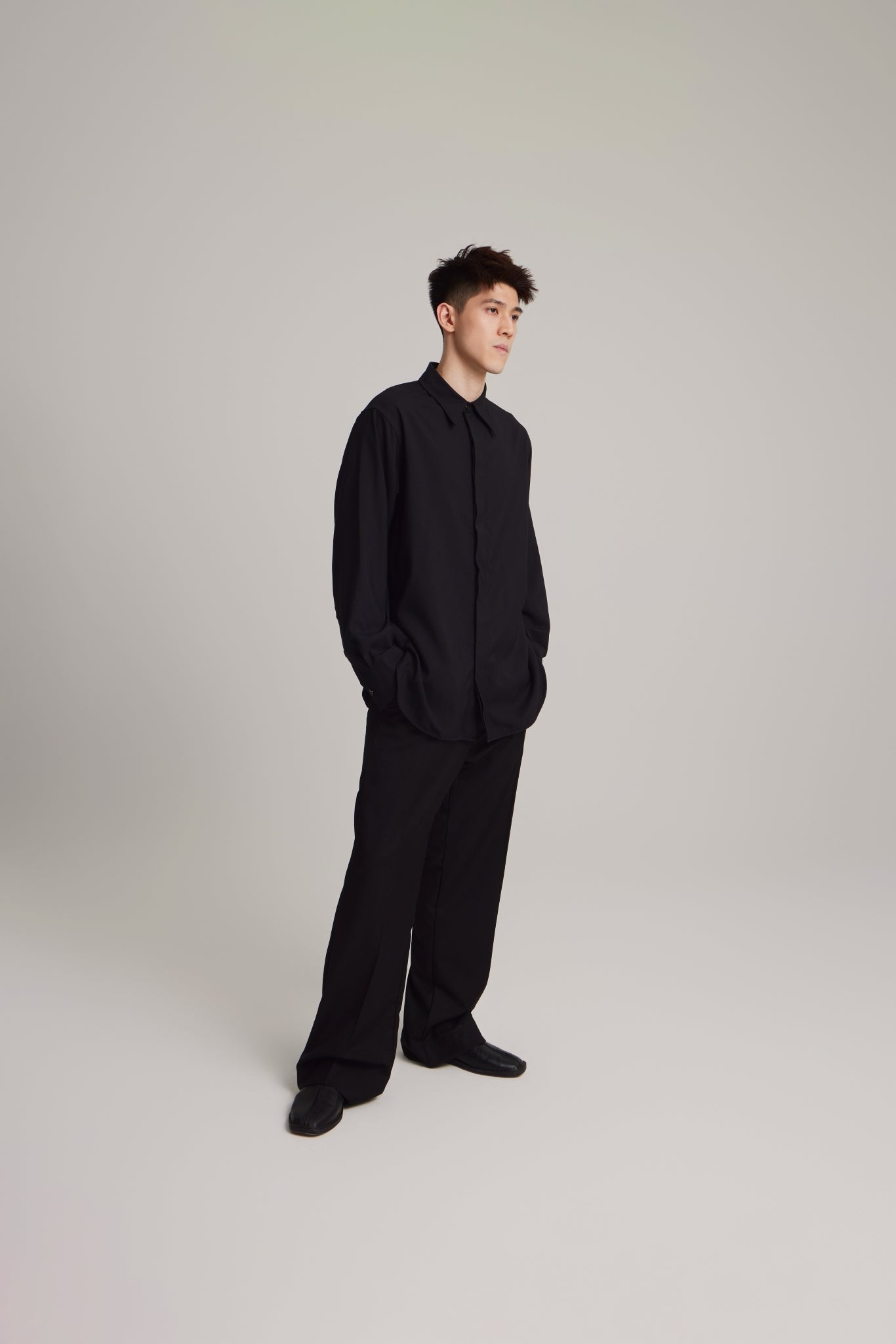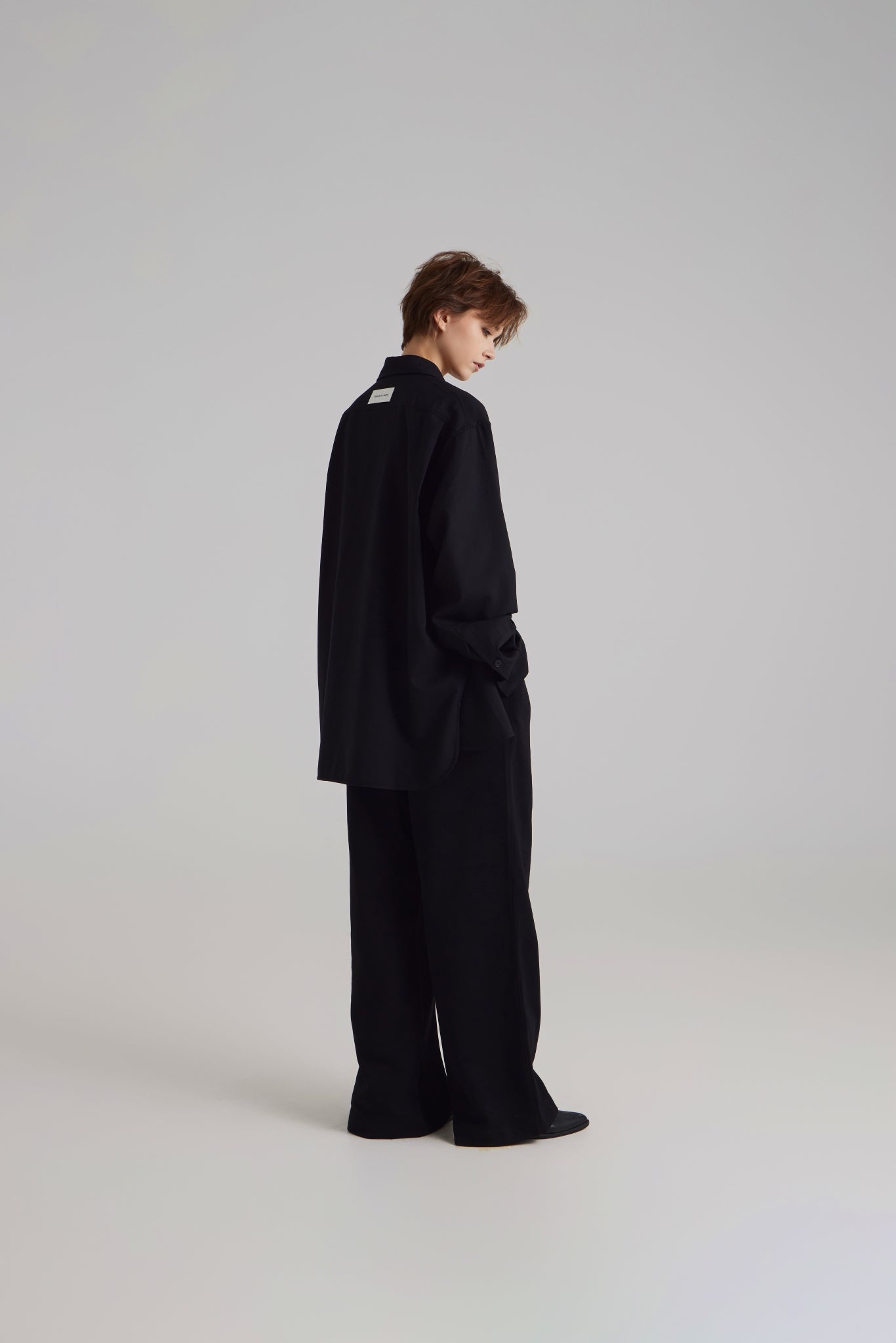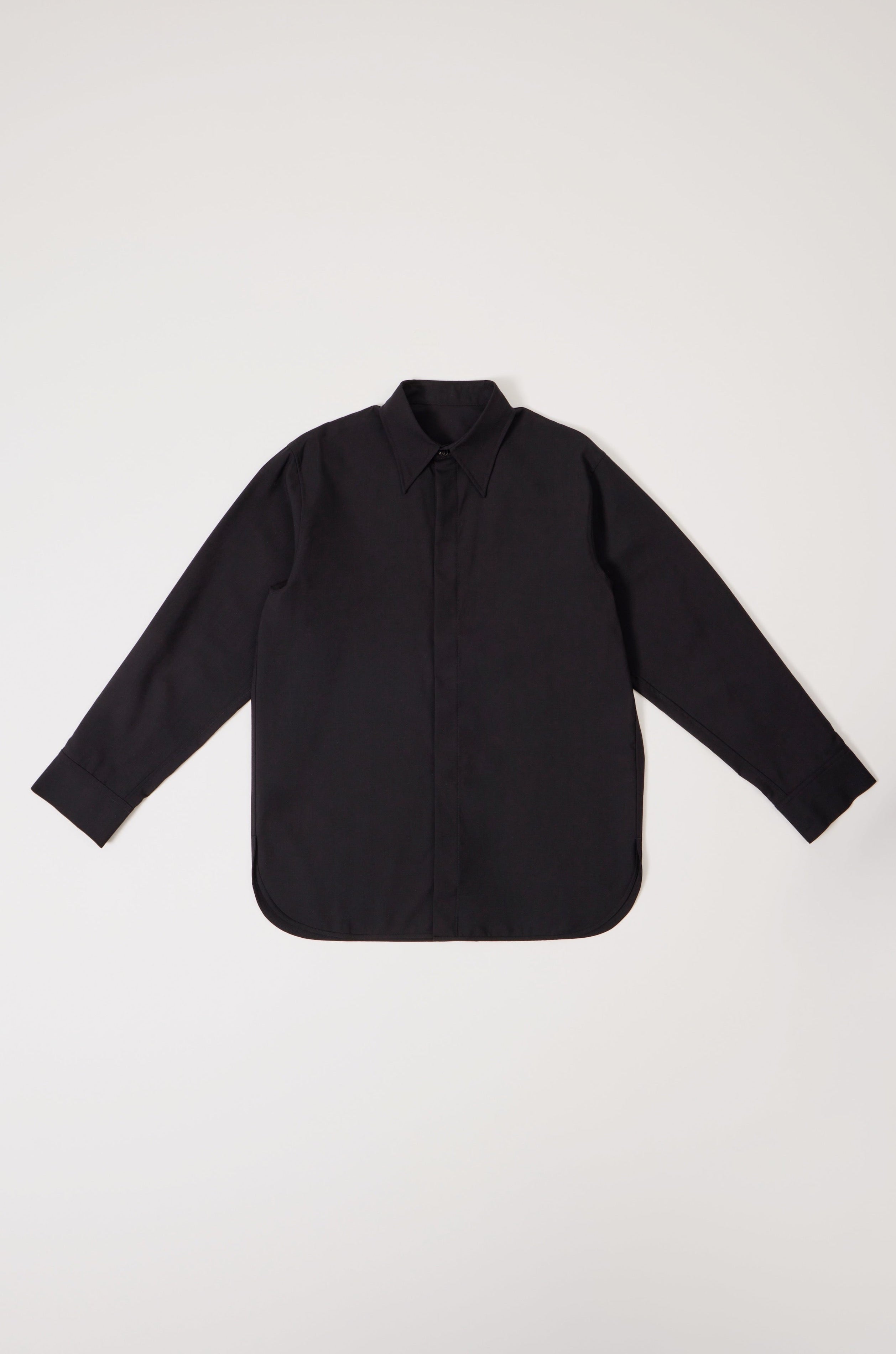 This shirt is designed with a long oversized silhouette and features a classic bold collar design with a hidden placket feature to create a clean, streamlined look throughout. A double pleat detail is also added on the back of the shirt matched with classic black horn buttons to give this shirt that extra luxury detailing.